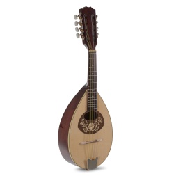 Плоская мандолина - португальская форма полностью цельная, верх из цельной ели, спинка из цельного 7-ми секционного клена, бока из цельного клена шлицевая головка, никелированная головка, синтетические кнопки кленовый гриф, гриф из твердой древесины, 17 никелированных серебряных фритов масштаб 332 мм, длина 610 мм, ширина ребра 210 мм, глубина ребра 72 мм ширина гайки 31 мм, мост из клена с поверхностью из твердой древесины глянцевая отделка сделано в Европе глянцевая отделка сделано в Румынии